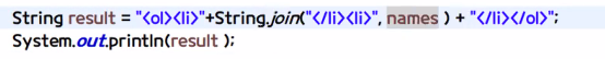 String result="<ol><li>"+String.join("<li></li>", names)+"</li></ol>";