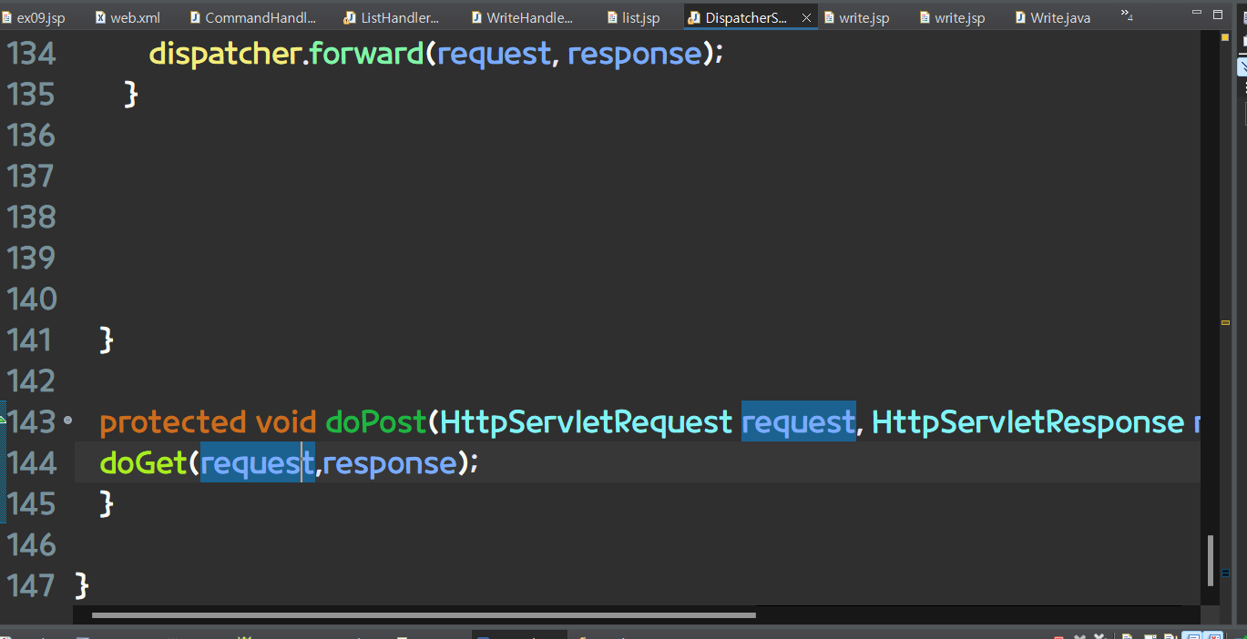 - post를 호출하더라도 doGet()익 실행되도록 doPost(){ doGet(r,r);}
