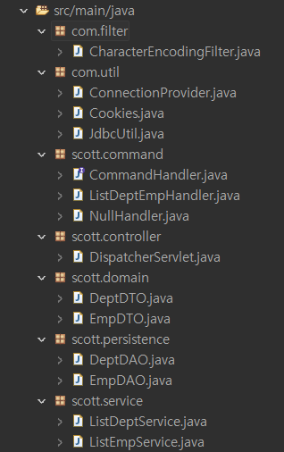 디스패처-프로퍼티스-커맨드핸들러-핸들러-서비스 -dto-dao-jsp
