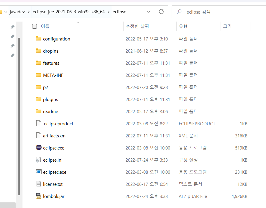 설치화면이 떠서 이클립스 폴더를 잡아주면 이클립스 폴더에 lombok라이브러리가 추가되어있다.